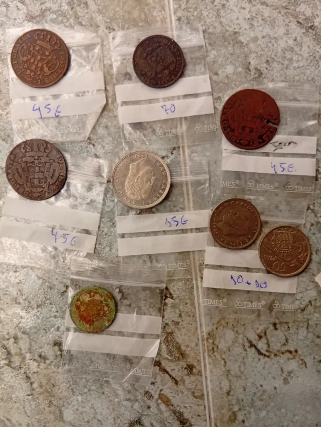 Dettagli del prodottoRaccolta di varie monete antiche, alcune con iscrizioni e dettagli storici. - Moneta di rame con stemma. - Moneta d'argento con ritratto. - Moneta di bronzo con incisione. - Moneta del valore di 50. La descrizione è stata tradotta automaticamente.