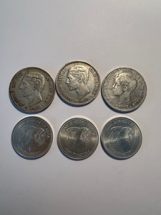 Dettagli del prodottoSet di sei monete antiche, tre di Alfonso e tre di Juan Carlos e Sofia. Alfonso XII 1878, Alfonso XII 1877, Alfonso XIII 1897, Juan Carlos y Sofia 2010, Juan Carlos y Sofia 2008, Juan Carlos y Sofia 2006. Conservazione: MBC+. Non accetto scambi né sconti esagerati. La descrizione è stata tradotta automaticamente.