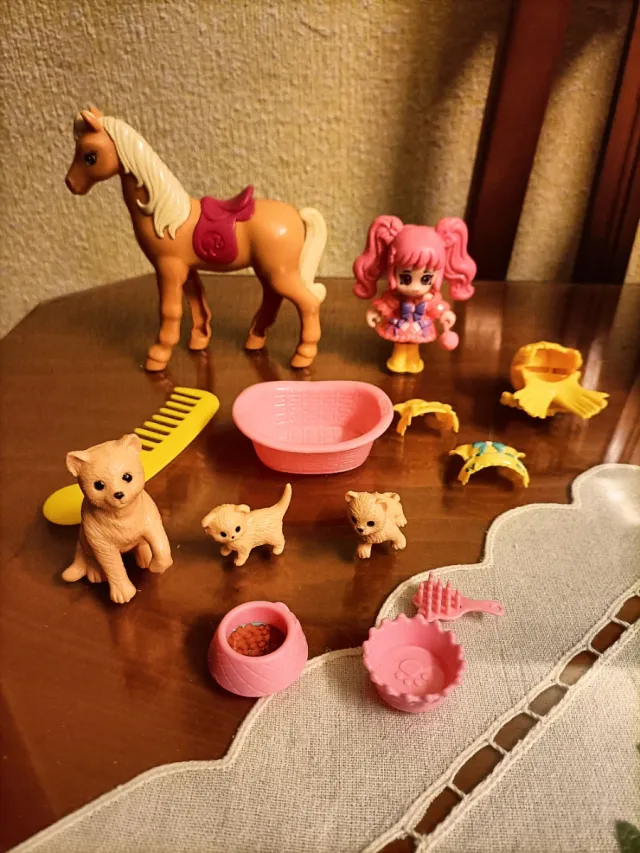 Set di figure e accessori per giocare. Include una bambola con capelli e vestito rosa, la stessa bambola può essere cambiata in giallo. Un cavallo marrone con sella. Due figure di cuccioli con la mamma, lettino e accessori per i cuccioli. Vari accessori come pettine, ciotole, lettino.
