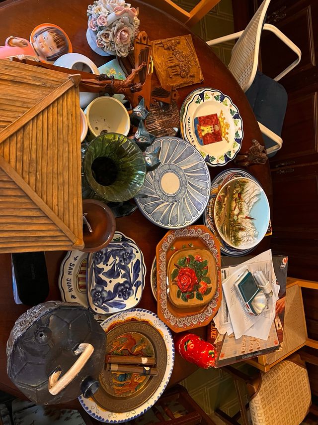 Dettagli del prodottoSet di piatti decorativi con design vari. - Piatto con design di fiori blu e bianchi. - Piatto con scena di caccia. - Piatto con scudo e bordo decorato. - Piatto con design di conchiglia. - Piatto con rosa centrale. - Piatto con design di San Giovanni. La descrizione è stata tradotta automaticamente.