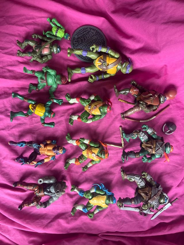 Dettagli del prodottoCollezione di action figure delle Tartarughe Ninja. Anni '90 e 2000, Playmates e bootleg. Il bootleg della spada ha quel braccio attaccato. Include varie action figure. Personaggi iconici della saga. La descrizione è stata tradotta automaticamente.