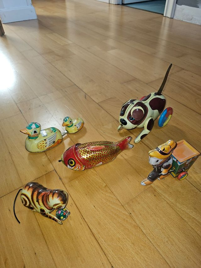 Dettagli del prodottoSet di cinque giocattoli in latta.
