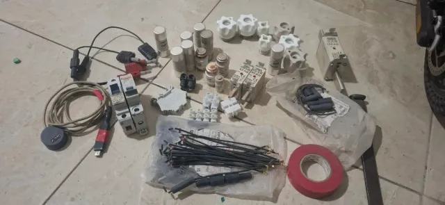 Dettagli del prodottoIn vendita lotto di materiale elettrico vario. - Fusibili di diverse dimensioni e amperaggi. - Interruttori automatici. - Connettori e terminali. - Nastro isolante rosso. - Cavi e adattatori. La descrizione è stata tradotta automaticamente.
