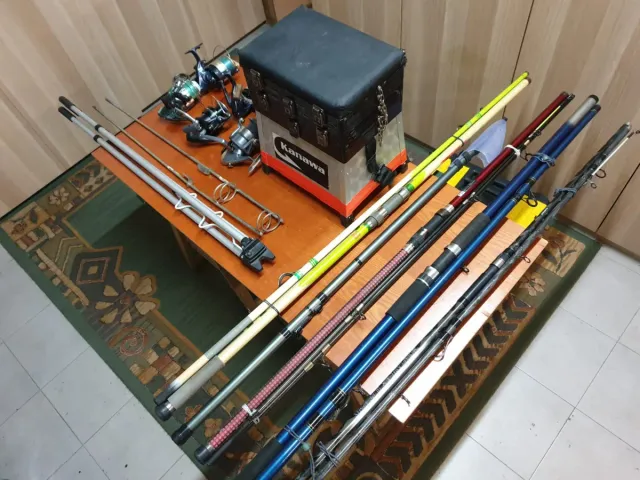 Dettagli del prodottoSet di attrezzatura da pesca che include varie canne e mulinelli. - Varietà di canne da pesca di diverse lunghezze e colori. - Più mulinelli da pesca. - Scatola da pesca inclusa. La descrizione è stata tradotta automaticamente.
