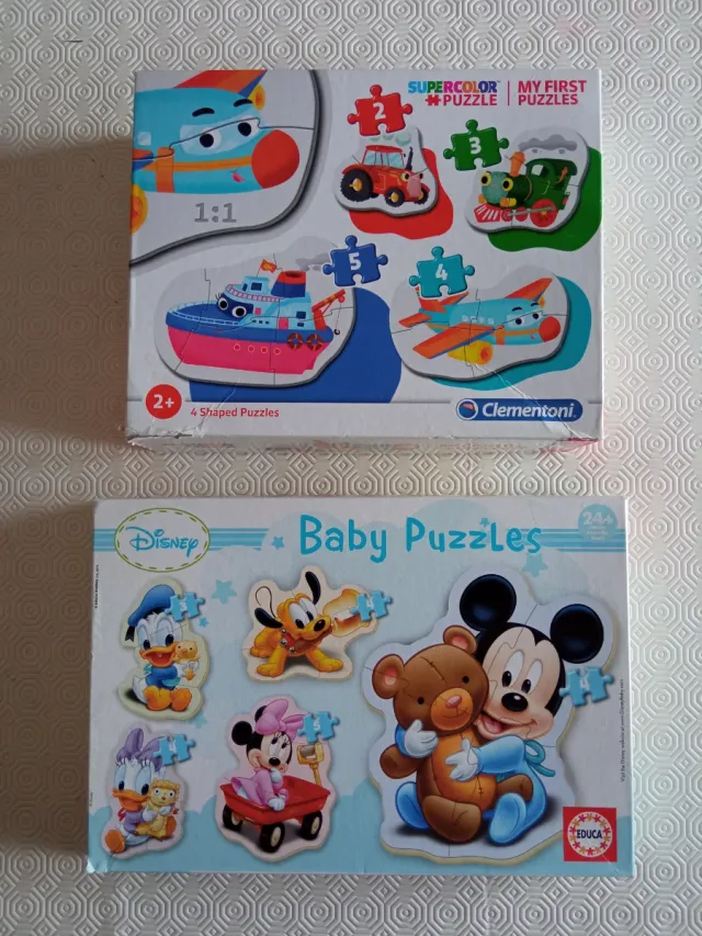 Dettagli del prodottoIn vendita due lot di puzzle per bambini. - Lot 1: Clementoni Supercolor My First Puzzles con 4 puzzle di veicoli (aeroplano, barca, trattore, treno). Età consigliata: 2+ anni. - Lot 2: Educa Baby Puzzles con personaggi Disney (Mickey, Minnie, Donald, Daisy, Pluto) e un orsetto. Età consigliata: 24+ mesi. Le scatole sono deteriorate, da qui il prezzo così ribassato. Altre cose per bambini nel mio profilo. La descrizione è stata tradotta automaticamente.