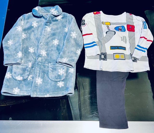 Dettagli del prodottoConsegna di abbigliamento per bambini in ottime condizioni, ideale per l'autunno e l'inverno. Include: ✨ Accappatoio/bavaglino TEX Baby (36m circa) - Colore grigio bluastro con stampa di fiocchi di neve - Molto morbido, caldo e comodo - Due tasche e chiusura con bottoni 🚀 Pigiama completo astronauta (Space Travel) - Maglietta a maniche lunghe con stampa astronauta - Pantaloni lunghi elasticizzati - Taglia indicativa 3-4 anni La descrizione è stata tradotta automaticamente.
