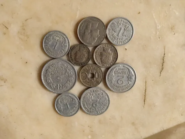 Lotto composto da 10 monete francesi di diverse annate. - Monete da 1 Franco. - Monete da 2 Franchi. - Monete da 5 Franchi. - Monete con date variabili.