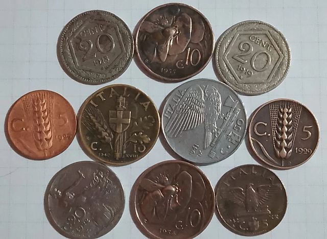Lotto composto da 10 monete del Regno d'Italia. - Monete coniate in diversi anni. - Diverse denominazioni presenti.