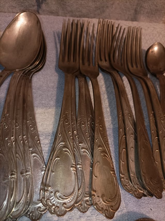 Dettagli del prodottoStock Posate in metallo argentato, stile Art decò, proveniente da più servizi non completi. Presenti marchi, come da foto.
