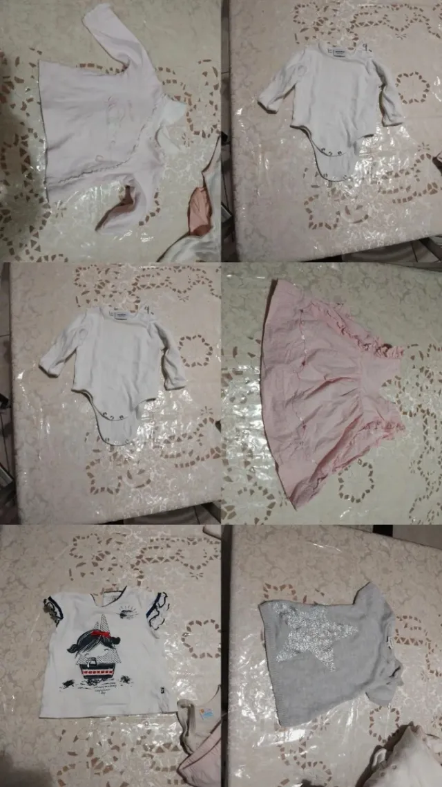 Set di 12 capi di abbigliamento per bambina. - Body a manica lunga bianchi. - Vestitino rosa con volant. - Maglietta bianca con stampa. - Altri capi assortiti.