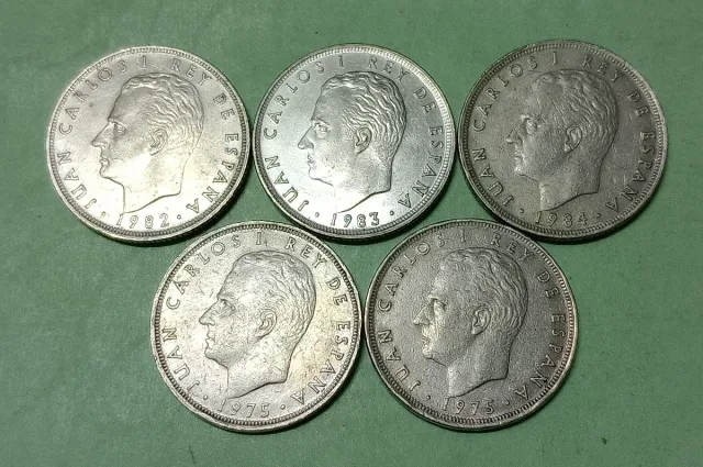 Lotto composto da 5 monete da 25 ptas anni diversi. - Effigie di Juan Carlos I. - Scritta Rey de España.