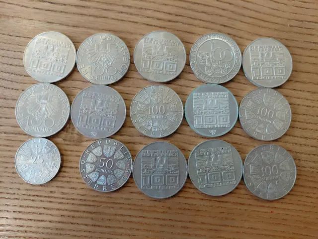 Lotto composto da 15 monete della Repubblica Austriaca. - 13monete da 100 scellini. - 1 moneta da 50 scellini. - 1 moneta da 25 scellini.