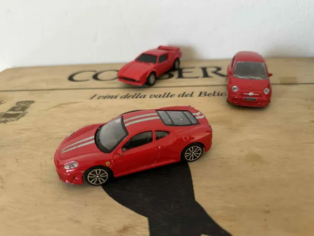 Dettagli del prodottoSet di tre macchinine giocattolo di colore rosso.