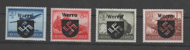 Dettagli del prodottoLotto composto da 4 francobolli originali del periodo Grossdeutsches Reich (1943–1944), ciascuno con sovrastampa postbellica “Werro” in nero e scudo contenente svastica bianca, applicata per finalità di denazificazione o commemorazione locale.