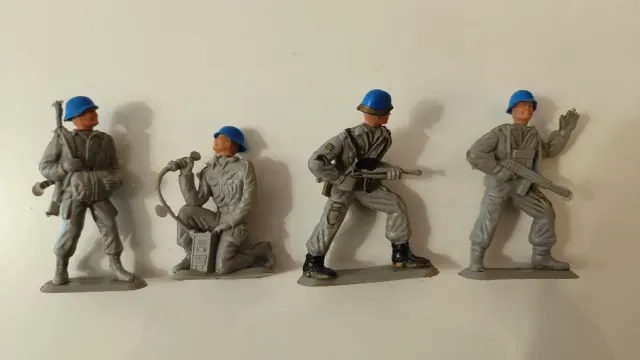 Lotto di 4 soldatini vintage in plastica grigia con elmetto blu. - Soldatini in posa dinamica. - Dettagli curati.