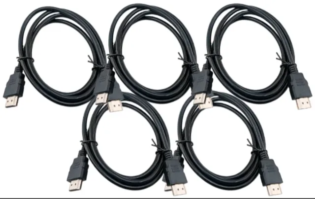 Set di cinque cavi HDMI neri. - Connettori placcati oro. - Supporto per risoluzioni fino a 4K. - Ideali per collegare dispositivi audio/video.
