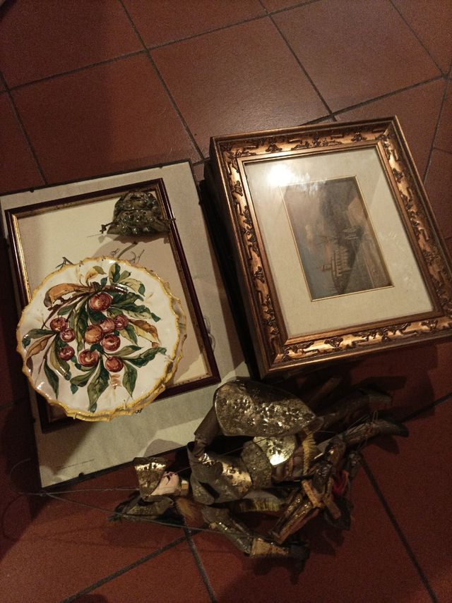 3 quadri, 3 piatti, marionetta, 3 filigrane, 3 quadretti, testa drago.