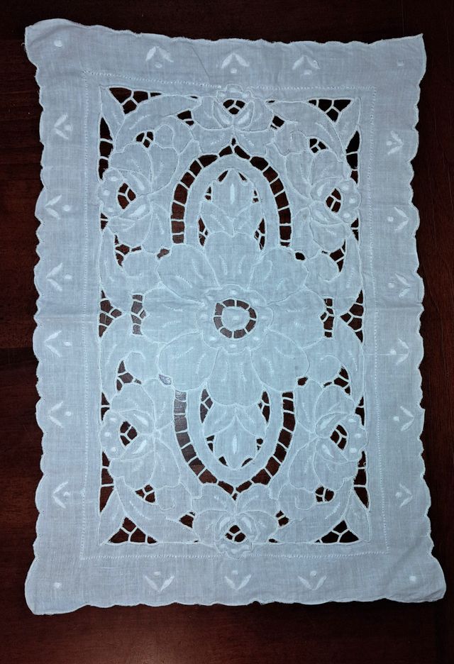 Dettagli del prodottoLotto di 7 centrini vintage in lino bianco (o misto lino), tutti con ricamo ad intaglio/punto pieno fatto a mano.