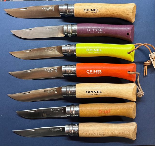 Lotto composto da 7 coltelli Opinel di diversi colori. - Manici in legno e colorati. - Lama in acciaio inox. - Modello N°08.