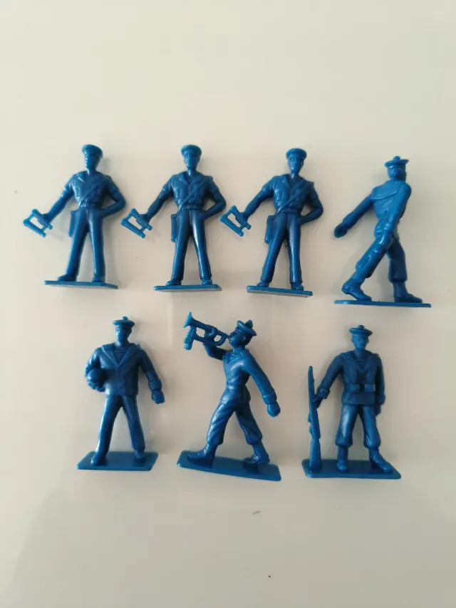 Set di 7 soldatini vintage in plastica blu.