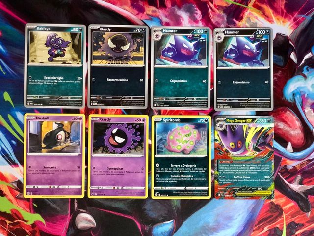 Nel lotto sono presenti: Mega Gengar EX, Hounter common e reverse Holo, Gastly reverse holo, Spiritomb, Duskul e Sablaye