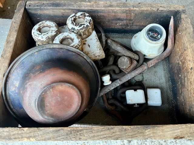 Dettagli del prodottoCome da foto lotto di pezzi di vecchi quadri elettrici in ceramica con prese e portalampada, ciotola in rame e oggettistica in ferro, antiquariato industriale, come da foto