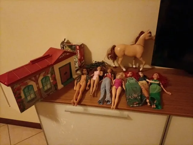 Dettagli del prodottoLotto composto da diverse bambole e un cavallo.