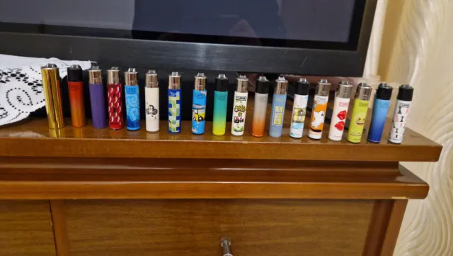 Lotto di 18 accendini Clipper. - Vari design e colori. - Modelli assortiti. - Alcuni accendini hanno la pietra focaia e alcuni non hanno la pietra focaia