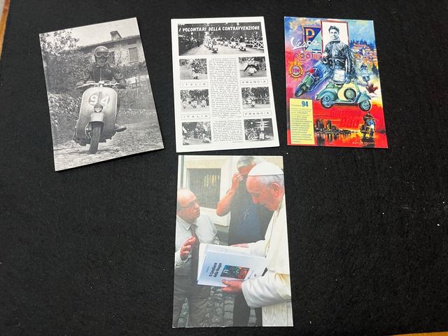 Lotto di materiale a tema Vespa, dedicato al vespista Cau. Quattro cartoline autografate dal grande cavaliere