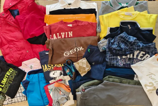 Dettagli del prodottoLotto misto di capi d'abbigliamento per bambino, taglia 8 anni. Include una varietà di magliette, felpe e pantaloni e giubbotto.
