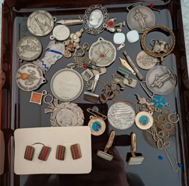 Dettagli del prodottoLotto misto di oggetti vintage, tra cui medagliette e gemelli.