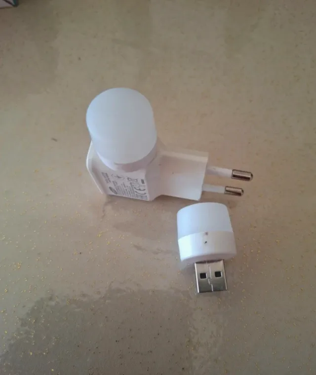 Luce notturna con due modalità di alimentazione. - Adattatore per presa a muro. - Connettore USB.