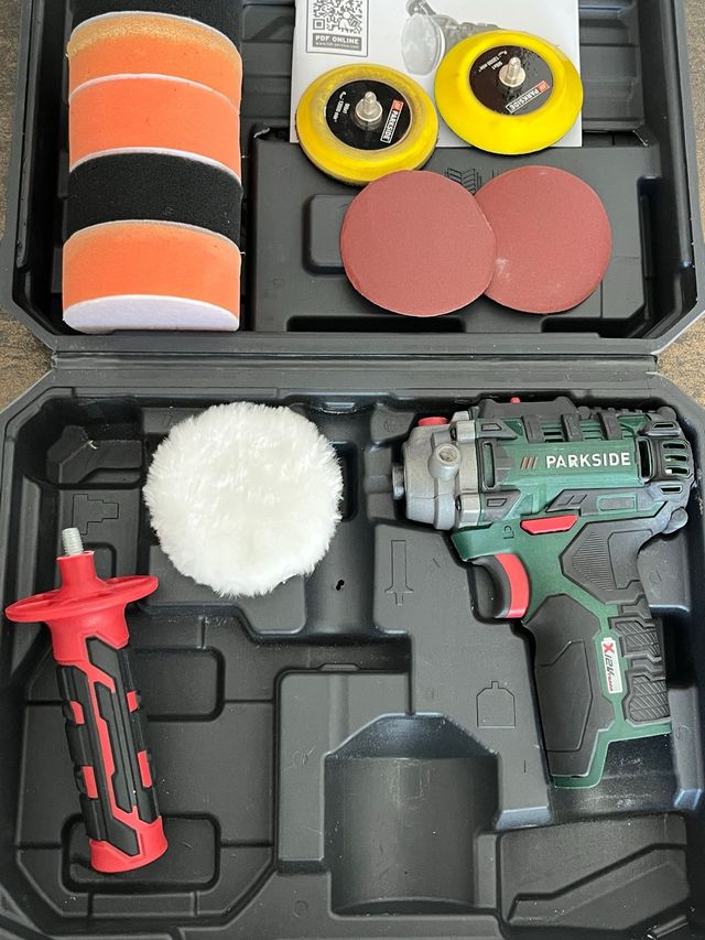 Dettagli del prodottoLucidatrice Parkside a batteria da 12V, completa di accessori.