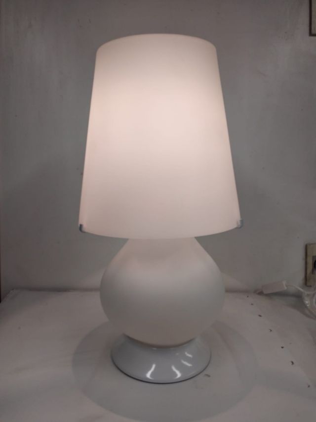 lume a 3 luci tutta in vetro bianco 2 accensioni lampadine non incluse (2 lampadine E14 parte sotto, parte sopra 1 lampadina E27 altezza 52cm diametro 28cm)