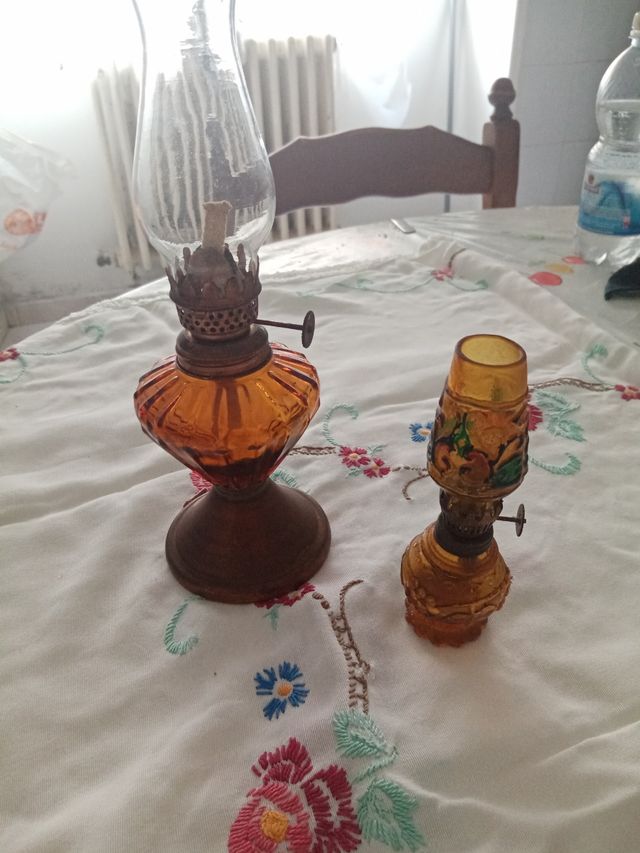 Dettagli del prodotto2 lumi uno grande uno piccolo entrambi in rame e vetro doppio con stoppino mai usati tenuti come oggetto di bellezza il piccolo lume avrà 60 anni,,,, il grande 30 anni,,,,