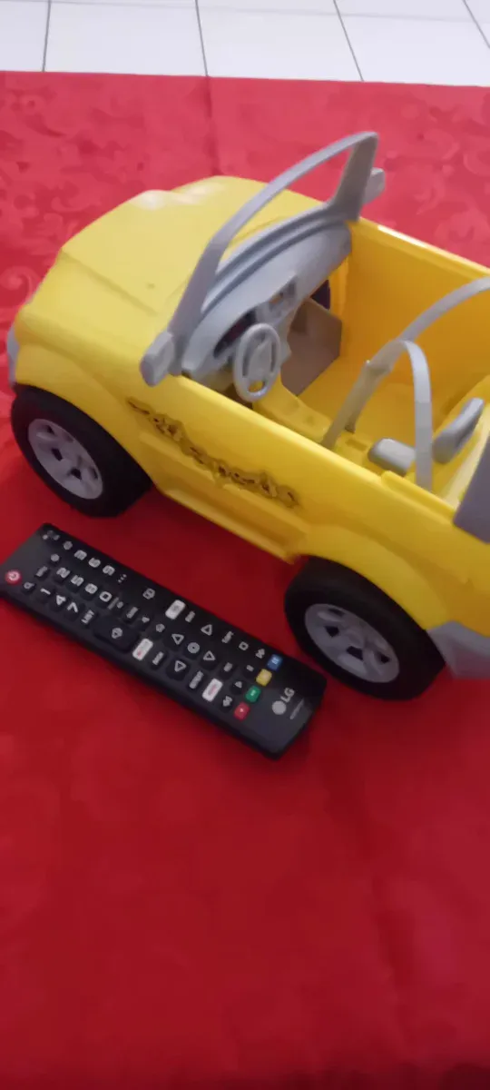 Macchina giocattolo gialla stile Barbie, circa 30 cm. - Design cabriolet con interni dettagliati. - Ruote nere. - Dettagli grigi su roll bar e parabrezza.