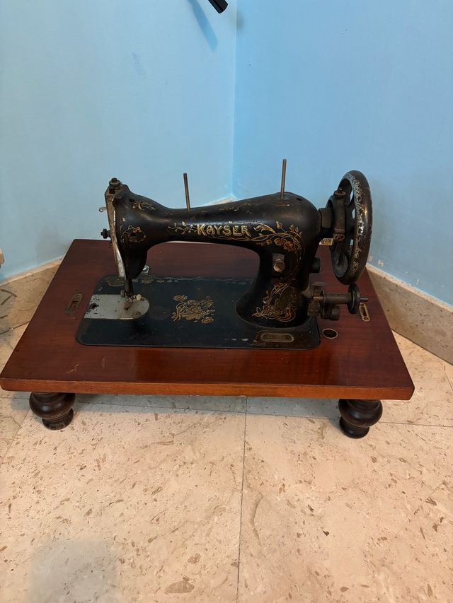 Dettagli del prodottoMacchina da cucire d'epoca con base in legno.
