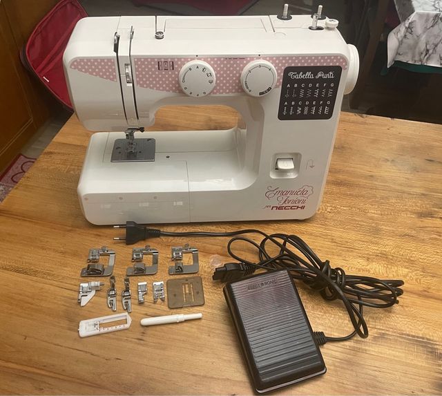 Macchina da cucire Necchi, modello Emanuela Jonioni. - Design bianco con dettagli a pois rosa. - Include vari accessori e piedini. - Pedale elettronico.