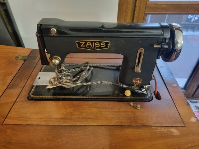 Dettagli del prodottoMacchina da cucire marca Zaiss con struttura in legno e pedale datata intorno agli anni '50/'60. Vendo per inutilizzo. Prezzo trattabile. Misure del prodotto