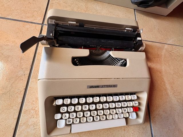 Macchina da scrivere vintage Olivetti Lettera 35, un classico del design italiano. Con custodia rigida - Colore beige. - Tastiera QZERTY.