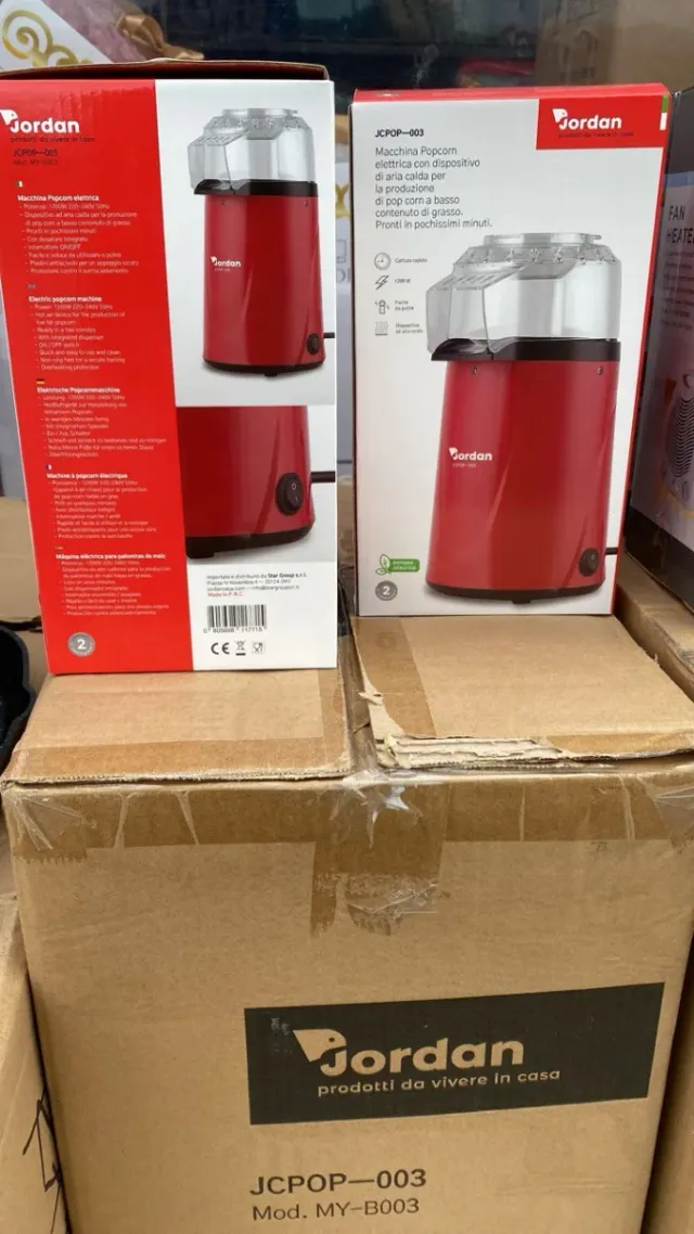 Dettagli del prodottoMacchina per popcorn elettrica Jordan, modello JCPOP-003. Realizzata in plastica rossa con finiture trasparenti.