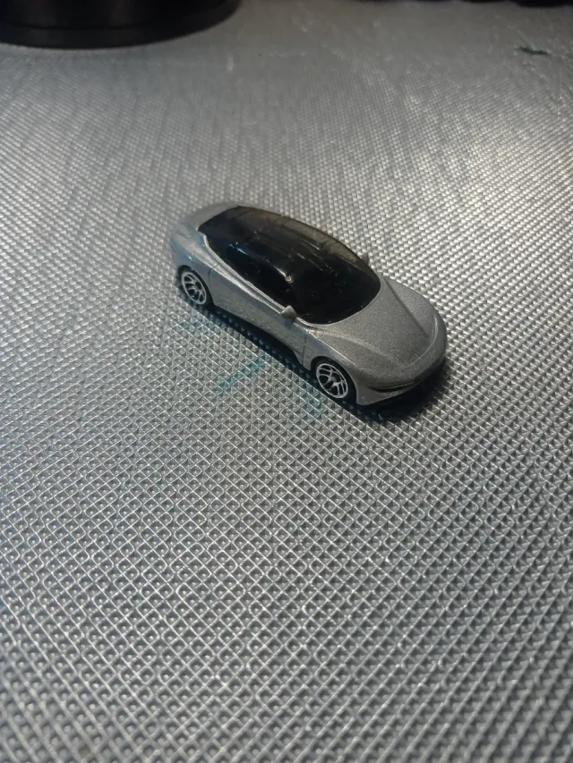 Macchinina giocattolo in metallo di colore argento con tetto nero. - Design sportivo. - Ruote nere con cerchioni argentati.