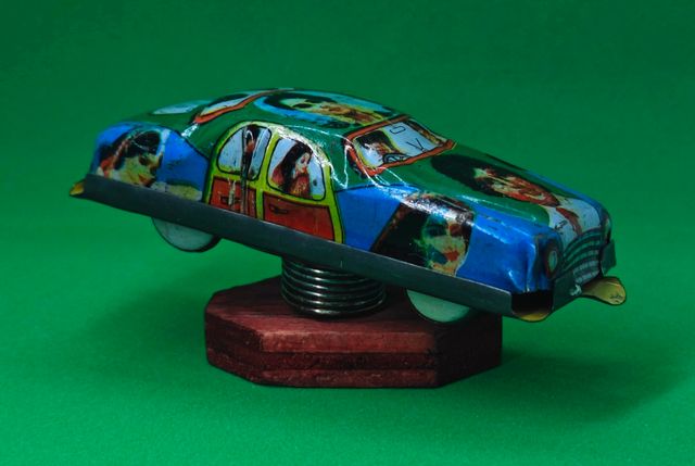 Dettagli del prodottoMacchinina vintage in latta, con decorazioni colorate che raffigurano volti.