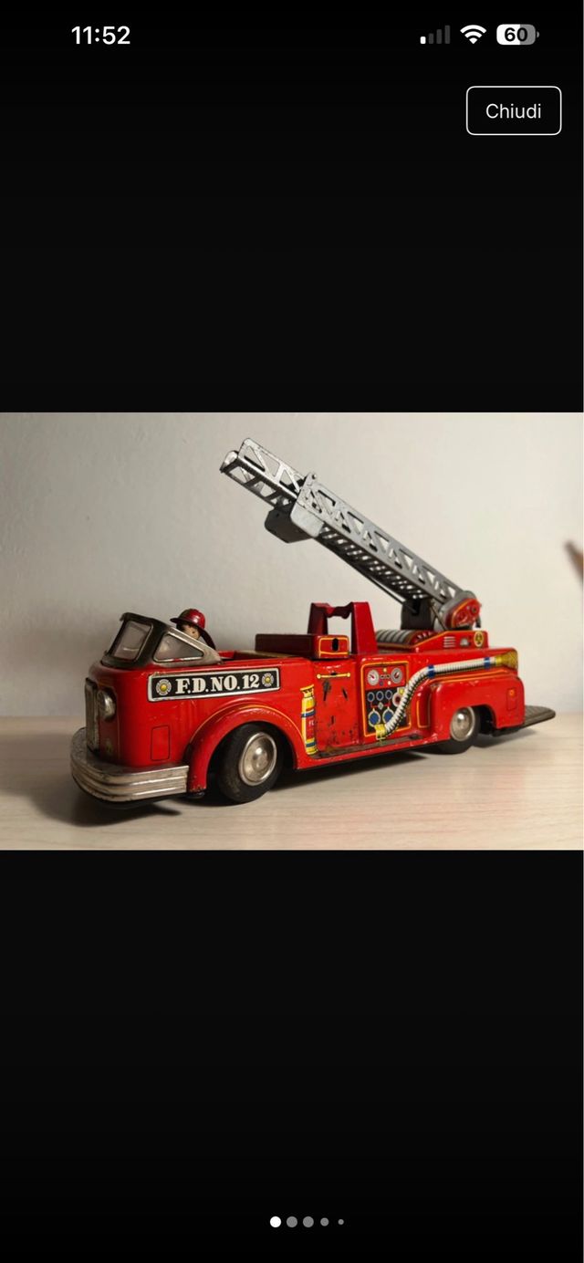 Vendo bellissima macchinina in latta litografata rappresentate un camion dei pompieri degli Stati Uniti (F.D. sta per 'Fire Departement in questo caso n.12). É un giocattolo degli anni 50-60 fatto in