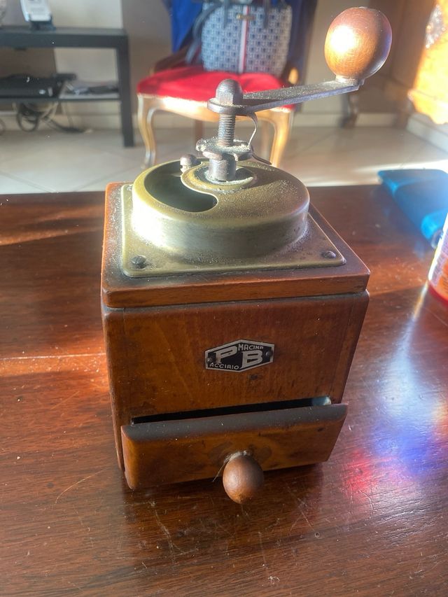 Dettagli del prodottoMacina caffè vintage con cassa in legno e dettagli in metallo.