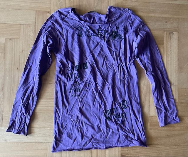 Dettagli del prodottoMaglia a maniche lunghe per bambina, di colore viola con diverse stampe grafiche.