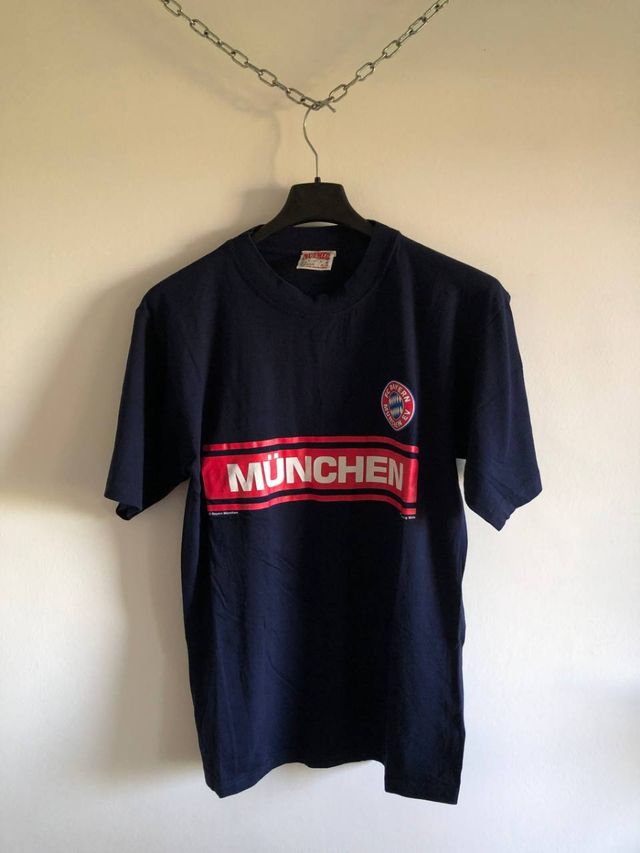 Dettagli del prodottoVendo maglia da calcio del Bayern Monaco, vintage. È una t-shirt a maniche corte, di colore blu scuro.