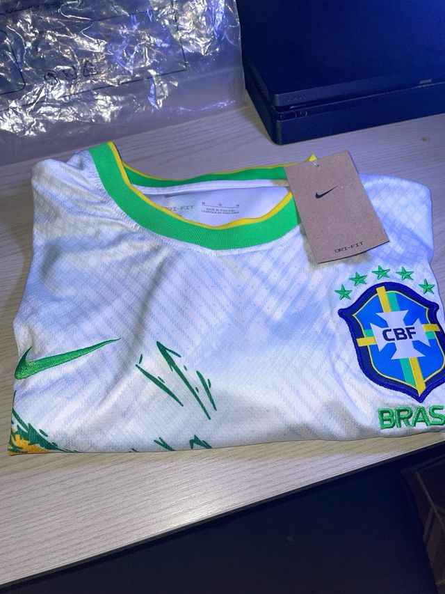 Maglia da calcio del Brasile, modello Nike Dri-Fit. - Colore bianco con dettagli verdi e gialli. - Logo Nike e stemma CBF. - Tessuto traspirante.