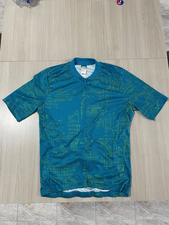 Maglia da ciclismo Triban (decathlon) con fantasia geometrica con 2 tasche + 1 con cerniera e dettaglio rifrangente tg L E una nera con solo una tasca con cerniera vestibilità regular