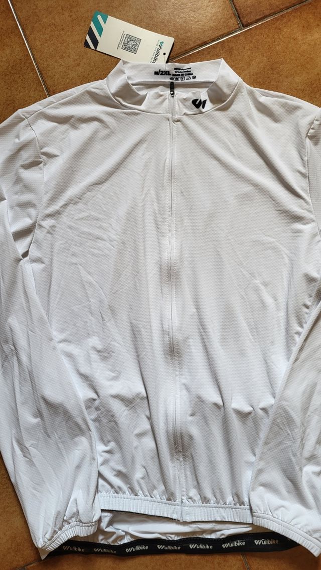 Maglia da ciclismo a maniche lunghe, di colore bianco. Nuova con etichetta - Tessuto tecnico traspirante. - Zip frontale. - Logo sul petto. - Polsini elasticizzati.